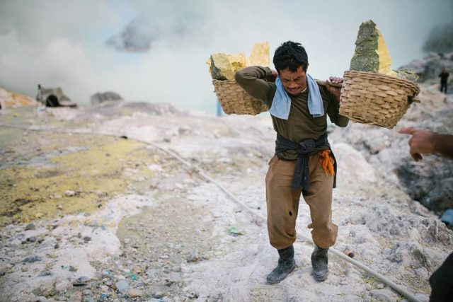 Yang menjadikan salah satu daya tarik lain di Kawah Ijen adalah aktivitas para petambang yang memikul puluhan kilogram belerang. Usaha keras mereka begitu banyak disorot oleh media di dalam negeri maupun di luar negeri. Dengan kondisi yang berbahaya mereka tetap mengais nafkah meskipun mereka harus bertaruh nyawa menghirup udara yang beracun dari Kawah Ijen. Setiap harinya, para petambang ini mesti menempuh rute sejauh 3 km ke pinggir kawah untuk menambang belerang dengan memikul beban antara 70 hingga 100 kilogram dengan peralatan ala kadarnya. Oleh pengepul, penambang diupah sekitar 1.000 rupiah tiap kilogramnya. Di kawasan tersebut, Anda juga bisa membeli oleh-oleh atau suvenir yang beraneka ragamnya, uniknya suvenir-suvenir ini terbuat dari belerang pula.